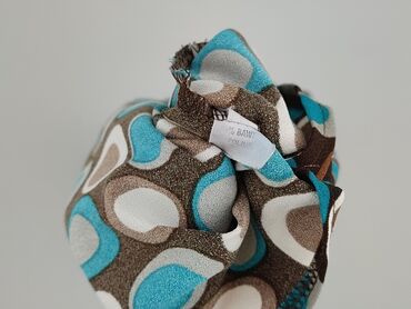 - Wzór: geometryczne kropki/okręgi w kolorach turkus, brąz, beż i szarość na ciemnobrązowym tle – retro/boho