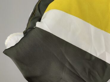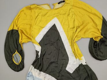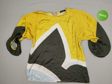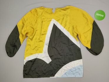 Bluzka damska dbbb, z oryginalnym, geometrycznym nadrukiem w odcieniach żółtego, oliwkowej zieleni, bieli i jasnego błękitu. Luźny krój z obniżoną linią ramion, okrągłym dekoltem oraz długimi, bufowanymi rękawami zakończonymi elastycznymi mankietami z ozdobnym wycięciem. Tył z niewielkim nacięciem przy dekolcie. Tkanina lekka, z satynowym połyskiem, miękko układająca się na sylwetce.