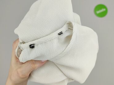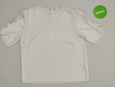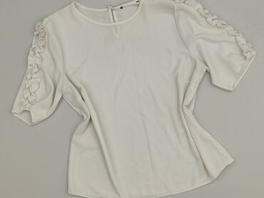 Bluzka damska w kolorze ecru/kremowym. - Fason: lekko bufiaste, krótkie rękawki; elastyczna, marszczona guma w dolnym ściągaczu i przy dekolcie - Dekolt: szeroki, w kształcie łódki/karczku, z wiąz...Stan: