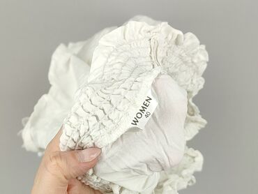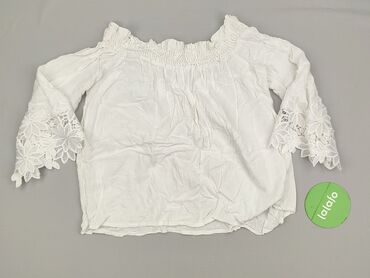 Bluzka damska z odkrytymi ramionami (hiszpanka) w biało‑niebieski, kwiatowy wzór. - Rozmiar: L (etykieta: WOMEN L) - Krój: luźny, z elastyczną gumką wokół dekoltu/ramion; krótkie, delikatnie falow...