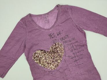 Bluzka damska z 3/4 rękawem, fioletowa (przecierany efekt). Przód zdobi duża aplikacja serca wyszywana złotymi cekinami oraz nadruk z napisami. Dekolt w kształcie litery V, lekko wydłużony fason.