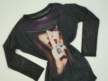 Bluzka damska TROCKY z siatki, czarna, z długim rękawem. Przód zdobi fotonadruk z motywem kobiety w kapeluszu i koronkowej masce, tył i rękawy półtransparentne (mesh). Okrągły dekolt wykończony lamówką, lekko luźny krój.