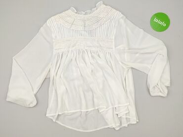 Biała damska bluzka z falbanami - Krój: zapinana na guziki z przodu, lekko skrócona długość. - Kołnierz: efektowny, okrągły kołnierzyk z falbaną. - Rękawy: długie, zakończone szeroką falbaną. - Ma...
