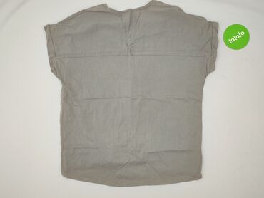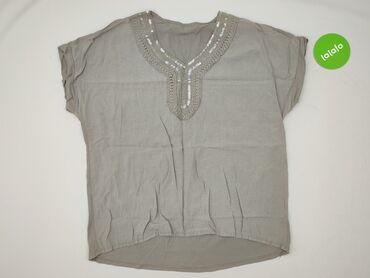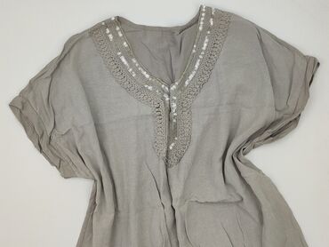 Bluzka damska z krótkim rękawem, w kolorze szarobeżowym. Luźny, zwiewny krój z delikatnie wydłużonym tyłem. Dekolt w kształcie litery V ozdobiony koronkową lamówką i błyszczącymi cekinami w tonacji srebrnej, co dodaje subtelnego efektu glamour. Materiał cienki, miękko układający się. Rękawy z podwinięciem, bez zapięć. Idealna do stylizacji casualowych i wakacyjnych, dobrze łączy się z jeansami, szortami lub spódnicą. Dla kobiety. Używana.