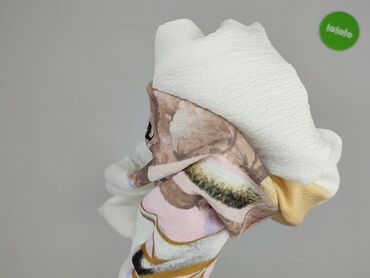 Bluzka damska z długim rękawem i dekoltem w serek. Biała, z miękkiej, lekko kreszowanej dzianiny o delikatnej fakturze. Przód zdobi nadruk pluszowego misia, kolorowe serduszka oraz napis „NICE” z połyskującymi elementami; tył gładki. Subtelne pastelowe przejścia kolorów (róż, fiolet, żółty) nadają całości dziewczęcego charakteru. Krój prosty, wygodny, idealny na co dzień. Materiał sprężysty i przyjemny w dotyku. Dla kobiety (nie dziecięca). Używana.