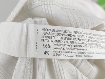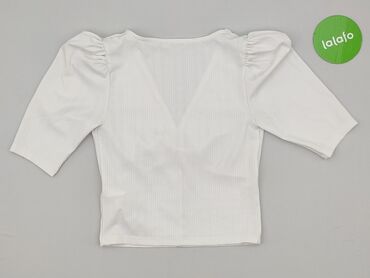 Biała damska bluzka z krótkim rękawem i efektowną koronką przy dekolcie w kształcie litery V. - Rozmiar: M (z metki) - Skład: 95% poliester, 5% spandex – materiał gładki, miękki, lekko elastyczny ...
