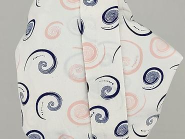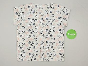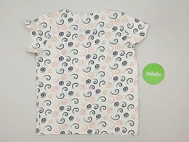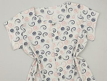 Bluzka damska z krótkim rękawem, wzór w spiralne motywy w odcieniach granatu, szarości i pudrowego różu na białym tle. Krój prosty, luźny, z okrągłym dekoltem. Przód z ozdobną, pionową listwą imitującą zapięcie (bez guzików widocznych na zewnątrz). Materiał lekki, miękko układający się, przyjemny w dotyku – idealny na cieplejsze dni. Długość do bioder, rękaw typu kimono/dolman zapewniający swobodę ruchów. Subtelny, uniwersalny print pasuje do jeansów, spódnic i elegantszych stylizacji. Przeznaczenie: kobieta, kolekcja casual.