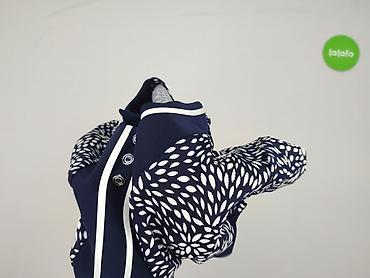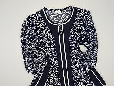 Bluzka damska z długim rękawem, rozmiar XL. - Fason: prosta bluzka z okrągłym dekoltem. - Dekolt wykończony granatową listwą z trzema ozdobnymi napami. - Wzór: gradient kropek/plamek – od drobnych...