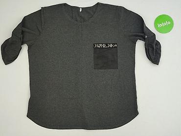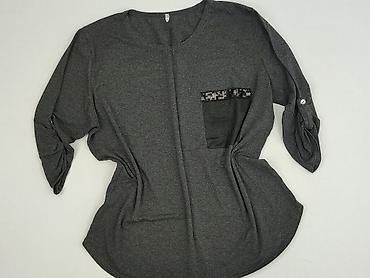 Bluzka damska z dzianiny, szara melanż. - Krój: swobodny, lekko asymetryczny dół (tył dłuższy), rękawy 3/4. - Dekolt: z przodu łódka, z tyłu wycięcie w kształcie litery V. - Ozdoba: na przodzie tr...Stan:
