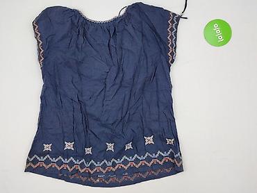 Bluzka damska z nadrukiem etnicznym - Krój: lekko taliowana, z zaokrąglonym dekoltem. - Rękawy: 3/4, marszczone przy mankiecie (efekt delikatnych fal). - Kolor i wzór: odcienie granatu i jasnego b...Stan: