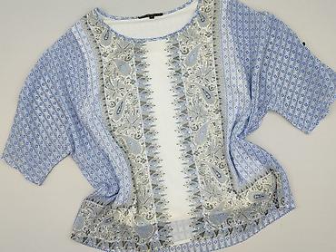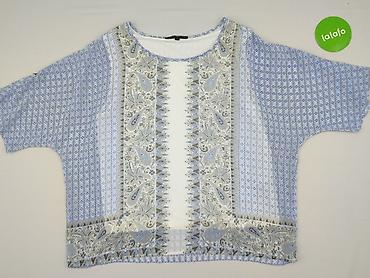 Bluzka damska z krótkim rękawem, rozmiar XL. - Krój: luźny, z dekoltem w serek zapinanym na guziki. - Wzór: białe tło w drobne czarne kropki z niebieskimi, graficznymi motywami/kwiatami. - Ma...