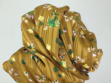 - Wzór i kolor: musztardowa podstawa z pionowymi, delikatnie połyskującymi prążkami oraz drobnym, kwiatowym nadrukiem w odcieniach zieleni, żółci i różu