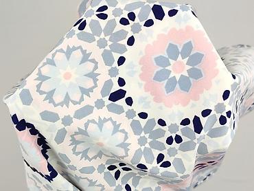 - Wzór: geometryczno-kwiatowy, mozaika w pastelowych odcieniach różu i błękitu z granatowymi akcentami.