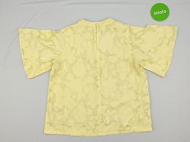 Bluzka damska z lekkiego, zwiewnego materiału w pastelowym, jasnożółtym kolorze. - Krój: luźny, z delikatną zakładką z przodu i dłuższym, zaokrąglonym dołem - Rękawki: krótkie, falbaniaste - Tył: ...Stan: