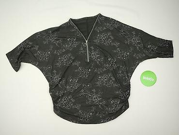 Bluzka damska z krótkim rękawem typu nietoperz, w czarnym kolorze z delikatnym, jasnym, kwiatowym nadrukiem. Dekolt w serek zapinany na metalowy zamek z ozdobnym kółkiem, umożliwiający regulację głębokości. Luźniejszy fason z marszczeniami po bokach subtelnie podkreśla sylwetkę i zapewnia swobodę ruchu. Miękki, elastyczny, przyjemny w dotyku materiał idealny na co dzień.