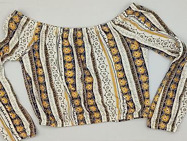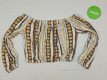 Bluzka damska hiszpanka, rozmiar S - Krój: hiszpanka z szeroką falbaną przy dekolcie, można nosić na lub opuszczoną z ramion - Wzór: geometryczny/rozetki w odcieniach mięty, bieli, żółtego i czern...