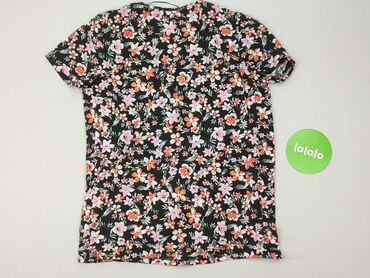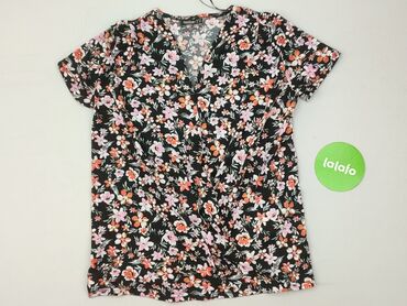 Bluzka damska Janina - Model: koszulka z krótkim rękawem - Wzór: gęsty, kwiatowy print w odcieniach różu, pomarańczu i bieli na czarnym tle - Dekolt: w kształcie V z lekkimi marszczeniami z przodu...