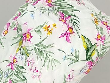 - Wzór: tropikalny/roślinny – białe tło, różowe i żółte kwiaty, zielone liście