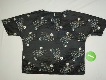 Czarna damska bluzka z połyskującym, kwiatowym nadrukiem. - Krój: luźny, prosty, z krótkim rękawem - Dekolt: okrągły, delikatnie obszyty - Wzór: subtelne kwiaty z drobnymi, błyszczącymi akcentami ...Stan: