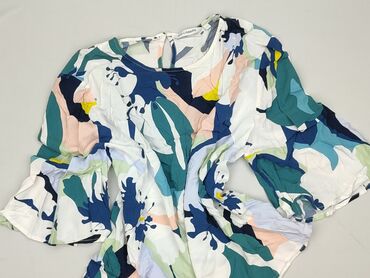 Bluzka damska Design by KappAhl, rozmiar XS. - Krój kopertowy z wiązaniem po boku - Dekolt w serek - Rękawy 3/4 z gumką przy mankiecie - Lekka, przewiewna tkanina - Biały kolor bazowy z akwarelowy...
