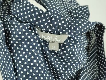 Uniwersalna, kobieca bluzka w klasyczne groszki – dobra do pracy i na co dzień, świetnie podkreśla talię dzięki wiązaniu. Marka: Katrin, metka z rozmiarem 18.