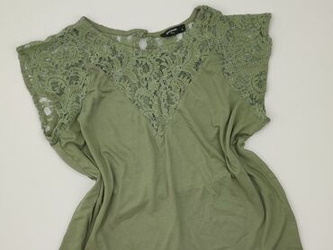 Ażurowa bluzka damska - Kolor: oliwkowy/khaki - Krój: prosty, lekko luźny - Rękaw: krótki - Dekolt: okrągły, obszyty lamówką w kolorze materiału - Materiał: koronkowa siatka z kwiatowym wzorem; pó...Stan: