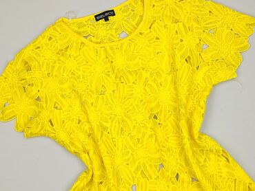 Ażurowa bluzka damska w kolorze pastelowej żółci. - Materiał: elastyczna koronka z drobnym, prążkowanym splotem i dekoracyjnymi motywami roślinnymi - Krój: dopasowany, długość do bioder - Rękaw: 3...