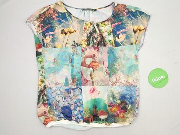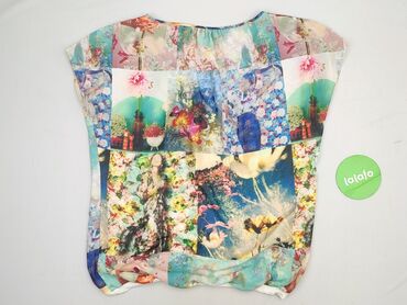 Bluzka damska z lekkiego, półprzezroczystego materiału, rozmiar S. - Kolorystyka: miętowa baza z dużym, akwarelowym nadrukiem kwiatów i motyli w odcieniach różu, fioletu i granatu. - Krój: luźny, ...