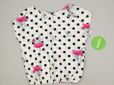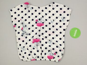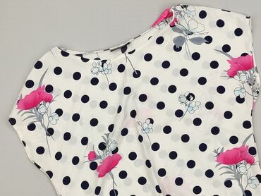Bluzka damska z krótkim rękawem, lekko oversize, z okrągłym dekoltem. Materiał cienki, gładki i elastyczny (dzianina syntetyczna). Kolor bazowy: ecru/biel. Wzór: - górna część w drobne kropki i sz...Stan: