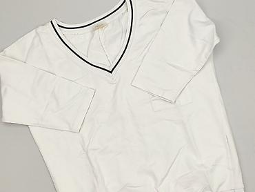 Bluzka damska MEGI Collection, rozmiar S/M. - Kolor: biały z nadrukiem liter w odcieniu taupe. - Rękaw: 3/4, zakończony ozdobnym pasem z drobnych kamieni/ćwieków. - Dekolt: okrągły. - Krój: prosty...