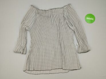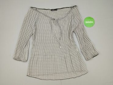 Bluzka damska w kolorze jasnego beżu/ecru. - Rozmiar: 36 (z metki) - Materiał: 100% poliester (cienka, lekko prześwitująca tkanina) - Krój: luźny, lekko marszczony - Dekolt: szeroki, z gumką i ozd...