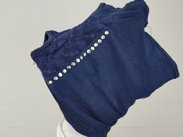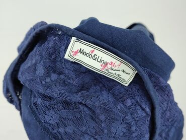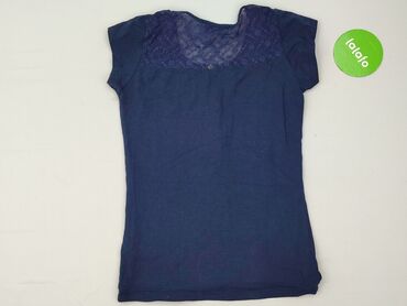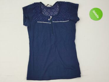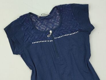 Bluzka damska w kolorze granatowym, rozmiar XL. - Krój: luźny, z okrągłym dekoltem; subtelne zakładki z przodu. - Rękawy: krótkie, wykonane z ażurowej koronki o kwiatowym wzorze. - Materiał: lekki...