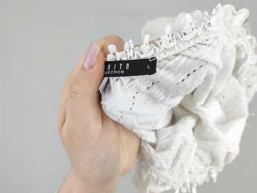 Romantyczna, letnia bluzka idealna do spódnic i jeansów; wygodna dzięki elastycznym wykończeniom i przewiewnej, haftowanej tkaninie. Marka widoczna na metce: MOHITO COLLECTION. Rozmiar L.