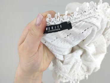 Bluzka damska MOHITO - Model: krótka, z przodem zapinanym na guziki - Rozmiar z metki: 36 - Kolor: biały - Materiał: 100% bawełna (lekka, przewiewna tkanina) - Detale: - romantyczne falbaniaste ...