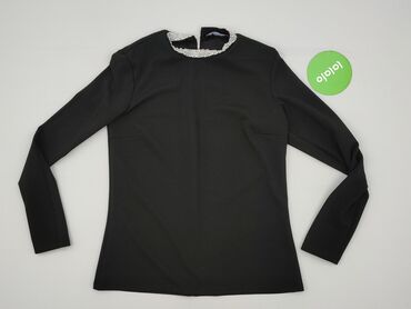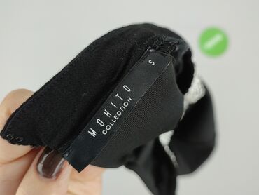 Bluzka damska Mohito, rozmiar S. - Kolor: czarny - Krój: taliowana z baskinką (rozkloszowany dół), krótkie rękawy - Dekolt: okrągły, z tyłu łezka zapinana na guzik - Detale: błyszczące lamówki/pas...