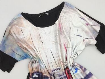 Bluzka damska Monnari, rozmiar S. - Krój: taliowana, z krótkim rękawem raglan. - Materiał: elastyczna dzianina; przód z nadrukiem, tył i rękawy gładkie czarne. - Wzór: abstrakcyjny/geometryczny w ...