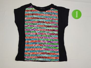 Bluzka damska Monnari, rozmiar S. - Krój: taliowana, z krótkim rękawem raglan. - Materiał: elastyczna dzianina; przód z nadrukiem, tył i rękawy gładkie czarne. - Wzór: abstrakcyjny/geometryczny w ...