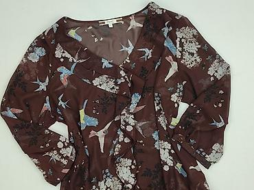Bluzka damska Next, rozmiar 14 (UK) - Zwiewna, lekko transparentna tkanina - Skład: 100% poliester - Brązowa baza z drobnym, kwiatowo-roślinnym nadrukiem w odcieniach różu, beżu i szarości - Krótk...