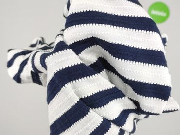 Bluzka damska OASIS, rozmiar S. - Fason oversize z krótkim, szerokim rękawem typu kimono - Dwustronny design: przód gładki granatowy z wstawkami w biało‑granatowe paski po bokach, tył w całości w ...