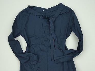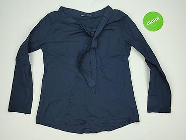 Uniwersalna bluzka idealna do stylizacji casualowych i do pracy; granat podkreśla elegancki charakter, a wiązanie przy dekolcie dodaje oryginalności.
