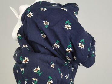 Bluzka damska bez rękawów, granatowa w biały, roślinny/ornamentalny wzór. - Fason: koszulowy, zapinany z przodu na guziki, kołnierzyk, lekko zaokrąglony dół. - Rękawy: krótkie-kimonowe (cap sleeve...Stan: