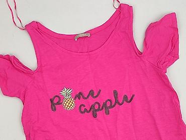 Bluzka damska Orsay w intensywnym różowym kolorze. Model z odkrytymi ramionami (cold shoulder) i krótkimi rękawami z falbanką. Z przodu ozdobny napis „Pineapple” z motywem ananasa. Okrągły dekolt. ...Stan: