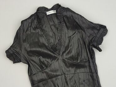 Bluzka damska Orsay - Kolor: czarny, satynowy połysk - Fason: dopasowany, peplum u dołu - Rękaw: krótki z delikatnym mankiecikiem - Kołnierz: stójka z falbanką - Zapięcie: ozdobne, asymetryczne za...