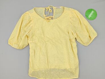 Bluzka/sweterek Orsay, rozmiar XL, w intensywnym musztardowym kolorze. - Fason prosty, lekko przedłużany, rękaw 3/4. - Okrągły dekolt z efektownymi wycięciami i wiązaniami z tyłu. - Miękki, e...Bluzka Orsay – żółta, lekka, w kwiatowy żakard