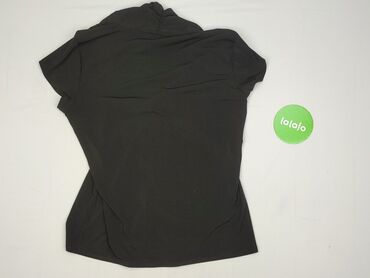 Czarna bluzka damska z długim rękawem, rozmiar L. Model o asymetrycznym dekolcie z ozdobnym marszczeniem i kółkiem przy ramieniu, wykończonym dwiema małymi perełkami. Gładka, elastyczna dzianina do...