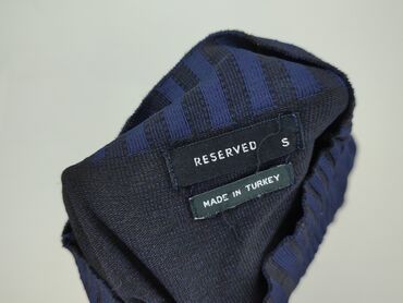 Sukienka damska w paski - Fason: prosta, lekko rozszerzana ku dołowi - Rękaw: krótki - Dekolt: półokrągły - Długość: za biodra/mini (z zaokrąglonym dołem) - Wzór: drobne, poziome paski granatowo-b...