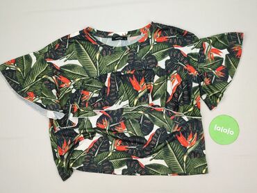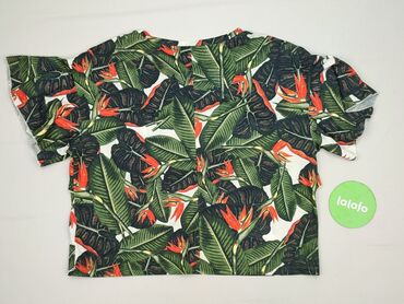 Bluzka damska RESERVED YFL, rozmiar S - Fason: luźny T‑shirt z odkrytymi ramionami (wycięcia na ramionach) - Rękaw: 3/4, z marszczeniem i troczkami przy końcach - Wzór: tropikalny print z liś...