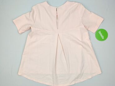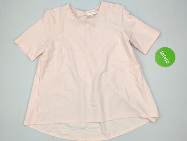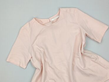Różowa bluzka damska z prążkowanej dzianiny - Krój: luźny, lekko wydłużony tył z zaokrąglonym dołem - Dekolt: w kształcie litery V z krótką stójką - Rękaw: krótki - Rozmiar z metki: S - Materiał: ...