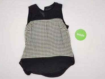 Bluzka damska RESERVED, rozmiar S/M. - Fason: bez rękawów, lekko przedłużony tył z zaokrąglonym dołem. - Góra i tył z czarnego, półprzezroczystego materiału; przód w geometryczny wzór „jodełki” w ...