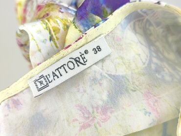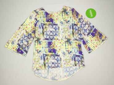 Bluzka damska Blue, rozmiar 38. - Fason: luźny, z delikatnym marszczeniem/przeszyciem przy dolnym brzegu tworzącym lekko „bombkowy” dół. - Rękaw: długi. - Dekolt: łódka. - Wzór: geometryczno-kwiat...